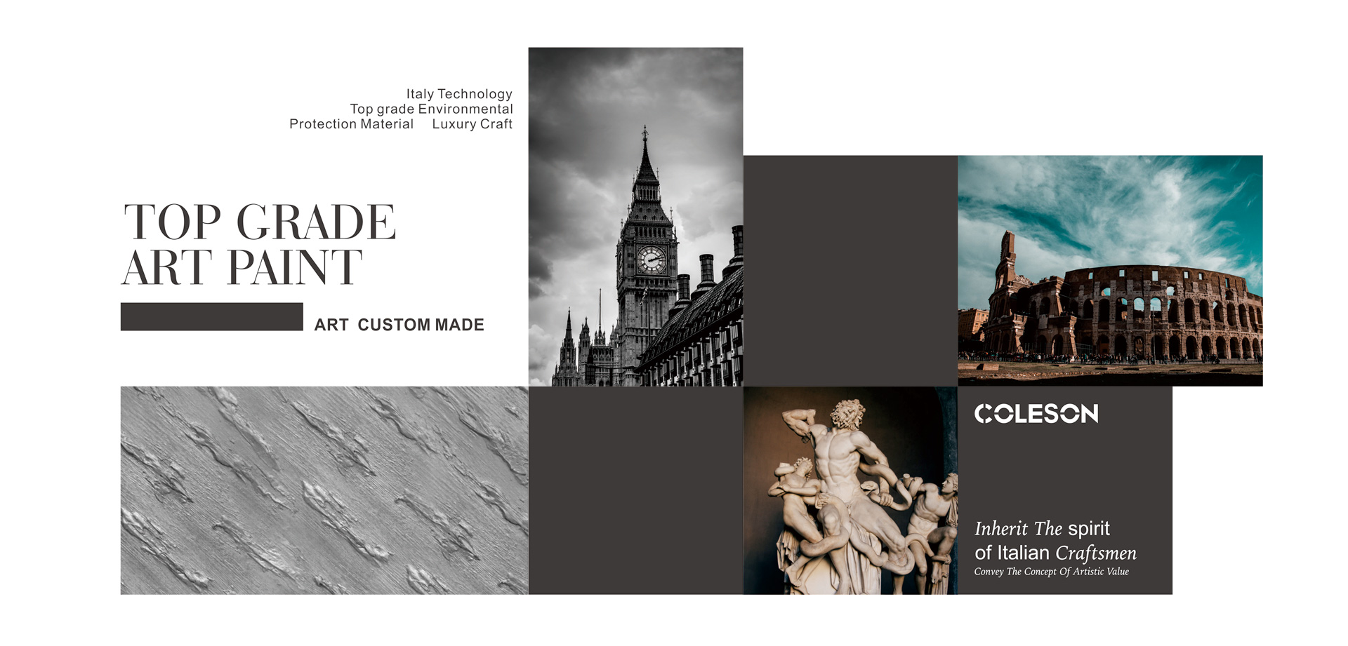 蔻森(COLESON)是來自意大利的高端藝術(shù)涂料品牌,隸屬于佛山蔻森 建筑裝飾材料有限公司。公司將意大利最頂級(jí)的技術(shù)及先進(jìn)的涂裝施工工藝體系引進(jìn)中國,主要經(jīng)營意大利藝術(shù)涂料,環(huán)保乳膠漆、水性色漿等。蔻森以傳承意大利工匠精神--傳達(dá)藝術(shù)理念價(jià)值,致力于為中國消費(fèi)者提供藝術(shù)涂料整體解決方案。